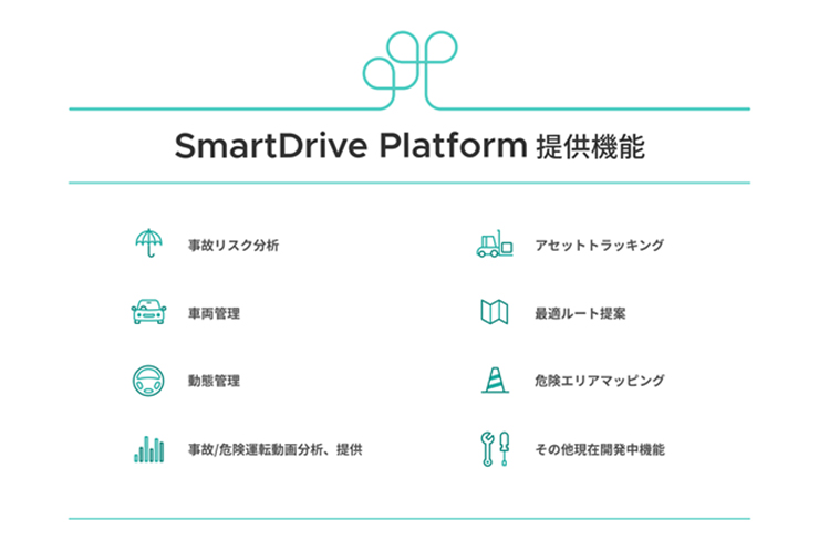 SmartDrive Platformが車両の最新の位置情報や走行経路、ジオフェンス(仮想境界)に出入りした場合の通知機能などを提供しているそうです。
